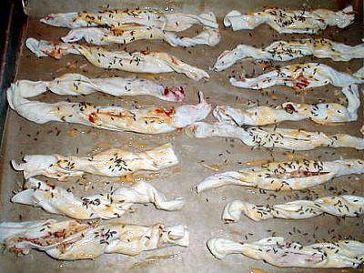 - Αραδειάστε τα κριτσίνια σε ταψί και ψήστε τα σε προθερμασμένο φούρνο στους 180-200 βαθμούς ,ανάλογα το φούρνο,μέχρι να ροδίσουν.