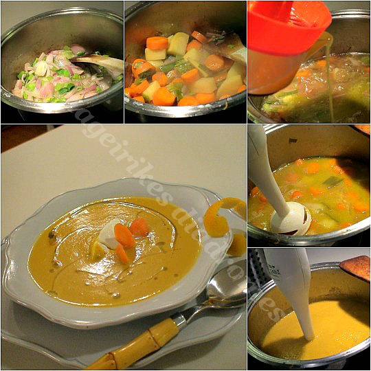 - Αλέθουμε τη σούπα μας μέσα στην κατσαρόλα με το μίνι πίμερ ή βάζουμε τη σούπα μας στο μπλέντερ και την αλέθουμε. Τη βάζουμε ξανά στηνκατσαρόλα και τη βράζουμε για 2-3 λεπτά, διορθώνουμε την πυκνότητα με ζεστό νερό καθώς και το αλάτι.