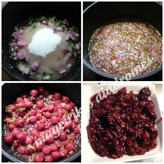 - Βάζουμε το ξίδι, τα κρεμμύδια, το σελερι ,τη ζάχαρη και τους σπόρους μουστάρδας να βράσουν και να μαλακώσουν.