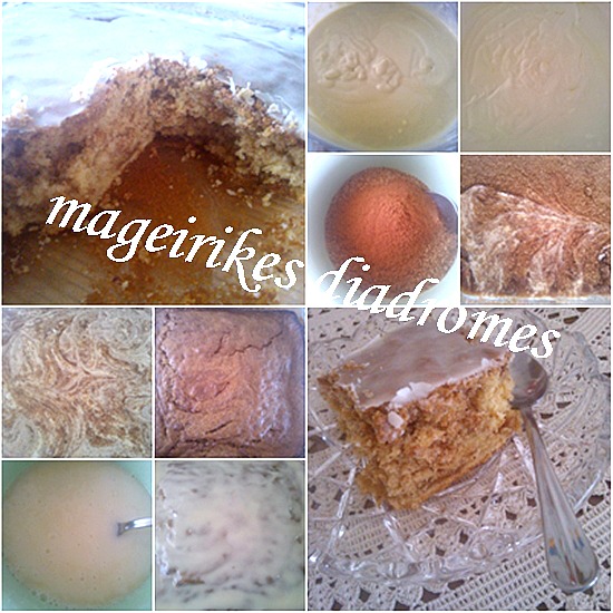 - Χτυπάμε όλα τα υλικά του γλάσου να γίνει λείο μείγμα και περιχύνουμε το χλιαρό κέικ.