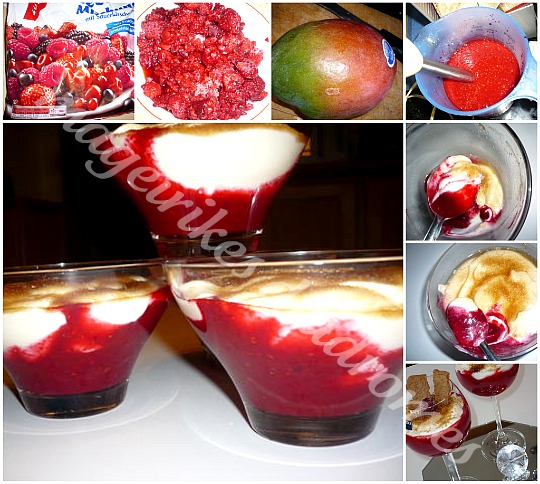 1. Κόβουμε με το μούλτι στό μπλέντερ τα φρούτα όλα μαζί καί τό περνάμε από τό τρυπητό, να έχουμε έτσι μία σος