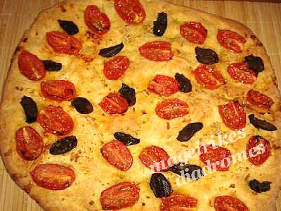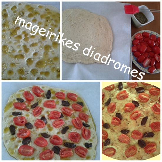 - Με κουτάλι ή πινέλο ρίχνουμε το μείγμα λάδι-σκόρδου στη φοκάτσια,απάνω πιέζουμε απαλά τα κομμένα ντοματίνια μας και τις ελιές.