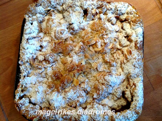 - Φτιαχνουμε την τριφτη ζυμη (κραμπλ): Βαζουμε σε λεκανη το βούτυρο, τη ζάχαρη, το αλάτι και την κανέλα, τα τριβουμε με τα δαχτυλα, προσθέστε το αλεύρι και συνεχιστε το τριψιμο, η ζύμη, να ειναι σαν ψίχουλα. Τελευταία προσθέστε και τα αμύγδαλα, τριψτε λιγο και πασπαλιζουμε επανω στα μηλα.