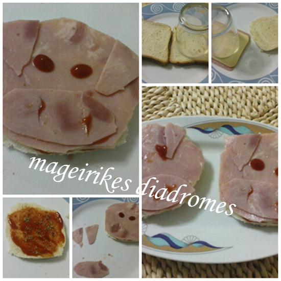 - Κόβουμε το τυρί και το ζαμπόν με το ίδιο ποτήρι, τοποθετούμε πρώτα το τυρί πάνω στη φέτα ψωμιού, απάνω το ζαμπόν.