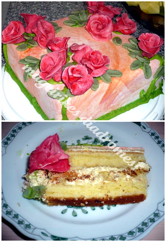 - Με την αμυγδαλοπαστα κανουμε τριανταφυλλα, φυλλα και τα κλωναρακια και στολιζουμε την τουρτα ετσι που να μας αρεσει.