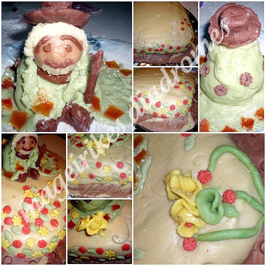 - Όταν σκεπάσουμε μέ αμυγδαλόπαστα, τότε το στολίζουμε μέ διάφορα λουλούδια φτιαγμένα από αμυγδαλόπαστα.