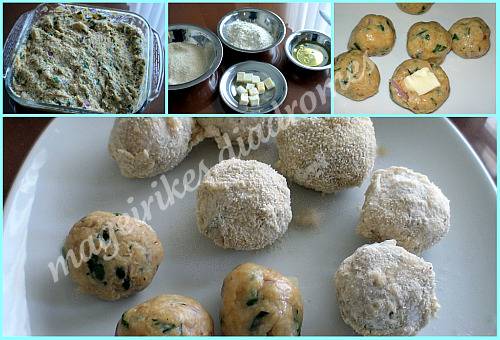 2. Μετά φτιάχνω μικρά μπαλάκια και στο κέντρο του καθενός βάζω και ένα κυβάκι τυρί και τα κλείνω με προσοχή σε ολοστρόγγυλα μπαλάκια.