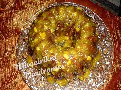 - Αλείφουμε με βούτυρο μια φόρμα και μετά πασπαλίζουμε μέσα αλεύρι, ρίχνουμε το μείγμα και το ψήνουμε στους 180 βαθμούς περίπου 1 ώρα.