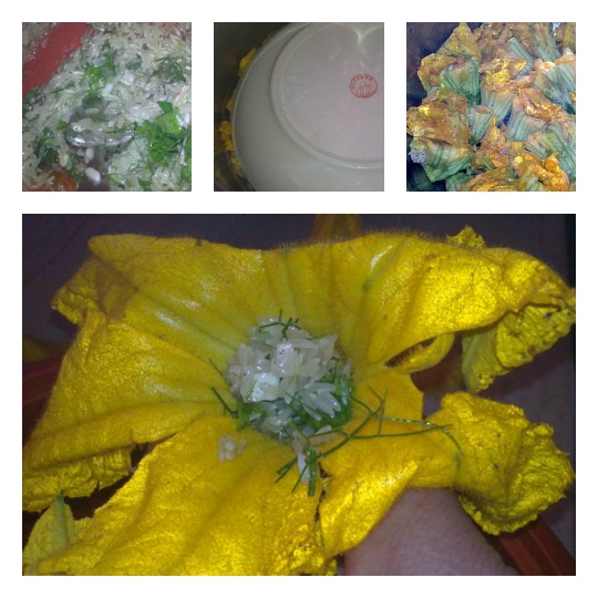 - Τα ανακατεύουμε καλά και παιρνουμε ένα κουταλάκι μικρό και βάζουμε σε κάθε ένα ανθό μια κουταλιά γέμιση ανάλογα κιόλας το πόσο μεγάλα είναι τα άνθη, απλά να θυμάστε ότι το ρύζι διπλασιάζεται.