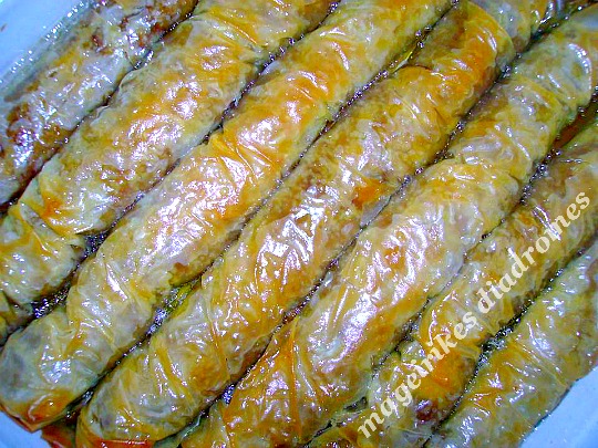 - Βουτυρωνουμε ανα δυο τα φυλλα μας, βαζουμε γεμιση και αρχιζουμε να τυλιγουμε, στρωνουμε στο ταψι και βουτυρωνουμε τα μπαστουνακια μας.