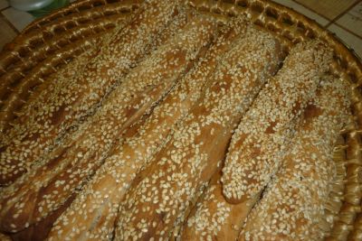 - Παίρνουμε μικρά κομμάτια ζύμης τα πλάθουμε μπαστουνάκια,κριτσινινάκια,τα βουτάμε σε πιάτο με νερό που έχουμε δίπλα μας και μετά σε σουσάμι ή ηλιόσπορους!!!για να κολλήσουν απάνω!!