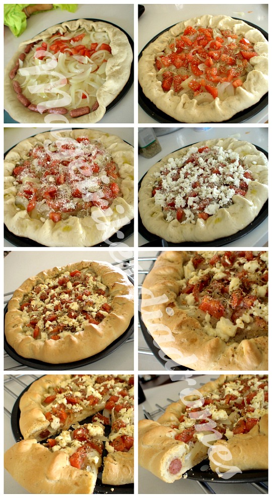 - Βάζουμε τριγύρω τα λουκάνικα και διπλώνουμε πάνω τους τη ζύμη που προεξέχει από το ταψί μας. Με τα δάχτυλά μας κάνουμε τις πτυχές για να έχουμε ωραίο σχήμα.