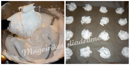 - Χτυπαμε τα ασπράδια μέχρι να σφίξουν, ριχνουμε και τη ζαχαρη αχνη ανακατεμενη με τη βανιλια, ριχνουμε και την καρύδα, ανακτευουμε λιγο.