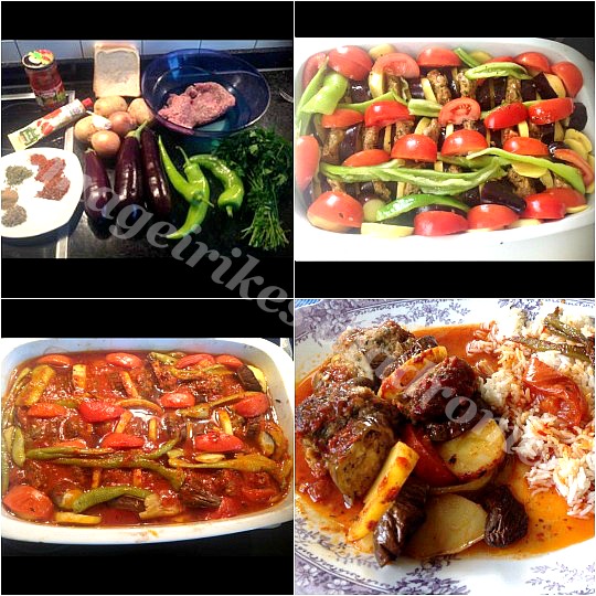 - Σε ενα ταψι βαζουμε μια φετα μελιτζανα ,πατάτα,κεφτέ ,το βαζουμε στο ταψι,ξανά πάλι το ίδιο σε σειρές. Άμα έχουμε περισσέψει πατάτες και μελιτζανες τα βαζουμε στα πλάγια γυρο γυρο. Αναμεσα στις σειρές βαζουμε τις πιπεριες Και τις ντοματες.