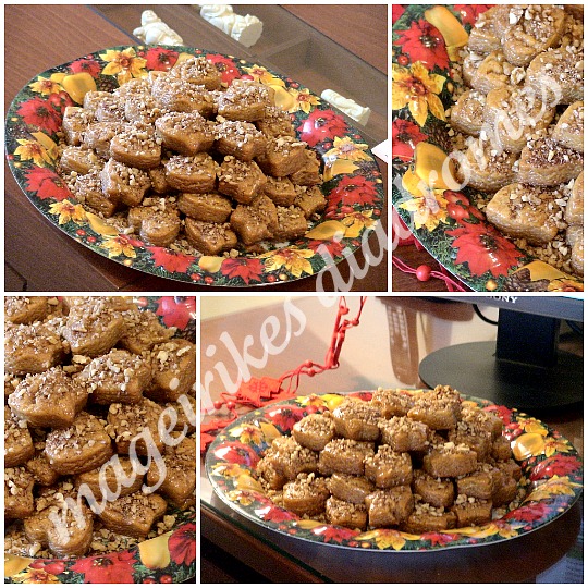 Όταν έχουν κρυώσει και είναι έτοιμα, τα βάζω σε στρώσεις σε πιατέλα και ανάμεσα ρίχνω το μείγμα που έχω ανακατέψει καρυδιού, κανέλας και γαρύφαλλου