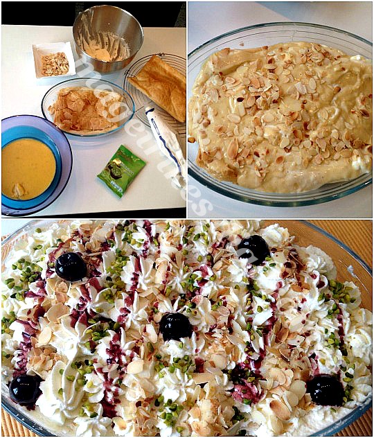 - Βαζουμε μεσα στην φορμα το ενα ψημένο φύλλο και βαζουμε επανω την κρεμα πασπαλίζουμε με τα μισά αμυγδαλα. Σκεπαζουμε με το αλλο φυλο Και γαρνίρουμε με την σαντιγι οπως θελουμε.