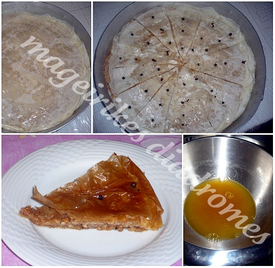 - Στο τέλος βάζουμε 2 φύλλα ζύμης κρουστας και κόβουμε τον μπακλαβά σε 9 η 10 κομμάτια, καρφώνουμε επάνω ένα καρφάκι γαρύφαλλο και ψήνουμε σε προθερμασμένο φούρνο στους 180 ° C στη μεσαία σχάρα για 30 λεπτά. η και περισσότερο, ώσπου να πάρει από πάνω και από κάτω ένα ωραίο χρώμα