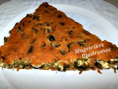 - Λαδώνουμε καλά ένα μεγάλο ταψί και στρώνουμε το μισό χυλό. Στρώνουμε το μείγμα των κρεμμυδιών με το χέρι μας ,και το πατάμε ελαφρά. Αραιώνουμε με λίγο νερό τον υπόλοιπο χυλό και τον ρίχνουμε επάνω να σκεπαστεί καλά το μείγμα. Ραντίζουμε με λίγο ελαιόλαδο. Το ύψος της πίτας δεν πρέπει να ξεπερνάει το ένα δάχτυλο.