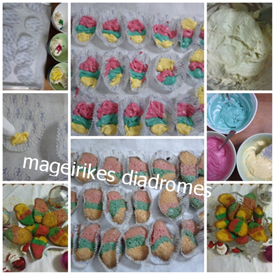 - Αν έχουμε σακούλες ζαχαροπλαστικής εφαρμόζουμε το κορνέ και βάζουμε σε φορμάκια με σχήματα Χριστουγεννιάτικα ή απλά σε χαρτάκια για μάφινς λίγο μείγμα κίτρινο,συνεχίζουμε με κόκκινο και τελειώνουμε με πράσινο,ή με όποια σειρά θέλετε εσείς τα χρώματα.