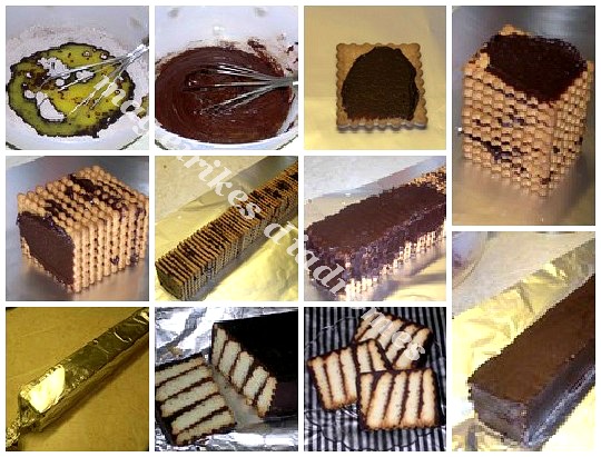 - Συνεχίζουμε με τα μπισκότα βουτώντας στο γάλα, αλείφοντας με τη σοκολάτα και κολλώντας τα όλα στη σειρά