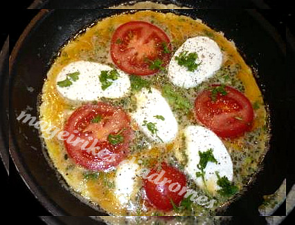 - Ρίχνουμε τα χτυπημένα αυγά μέσα και βάζουμε επάνω την μοτσαρελα με την ντομάτα .