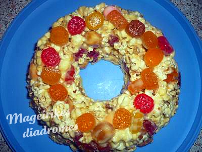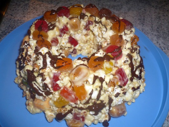 - Λαδώνω μια φόρμα του κέικ με στεφάνι,αδειάζω τα ποπ-κορν και πατάω με το χέρι καλά. Αφήνω να σταθεί τουλάχιστον 10 λεπτά και αναποδογυρίζω προσεχτικά σε πιατέλα.