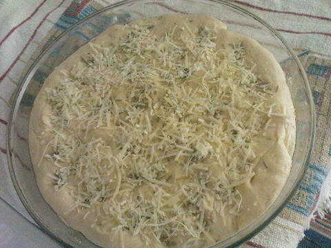 - Μεταφέρουμε τη ζύμη μας σε ταψάκι στρογγυλό 26εκ. με την λαβή μιας ξύλινης κουτάλας κάνουμε λακκάκια στη ζύμη κάθε 2,5 εκατοστά, ρίχνουμε το υπόλοιπο λαδι πάνω στη ζύμη. Πασπαλίζουμε με δενδρολίβανο και παρμεζάνα, σκεπάζουμε και αφήνουμε άλλα 35 λεπτά να φουσκώσει πάλι.