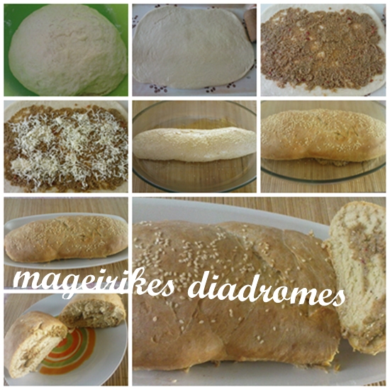 - Βάζουμε το ρολό μας σε λαδωμένο ταψί με την ένωση προς τα κάτω, αν θέλουμε πασπαλίζουμε με σουσάμι, σκεπάζουμε και αφήνουμε 30 λεπτά να φουσκώσει.