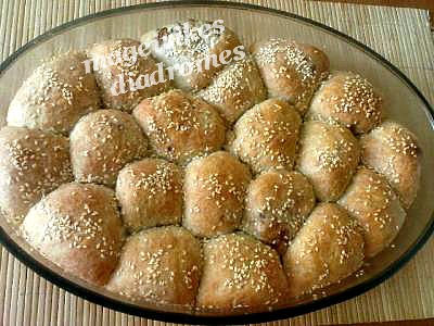 - Το ψωμάκι μας θα δείτε να έχει φουσκώσει πολύ ωραία. Το αλείφουμε με γάλα ή νερό, το πασπαλίζουμε με σουσάμι και το ψήνουμε σε προθερμασμένο φούρνο στους 200ο για 40 λεπτά περίπου, ανάλογα τον φούρνο ή ώσπου να ροδίσει.