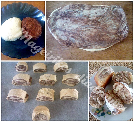 - Βάζουμε την καφέ ζύμη πάνω στην άσπρη και τυλίγουμε σε ρολό. Με μαχαιράκι κόβουμε μικρά ρολάκια, τα βάζουμε σε λαμαρίνα με λαδόκολλα και τα ψήνουμε για 15-20 λεπτά, ανάλογα το φούρνο, προσέχοντας μην μας καούν.