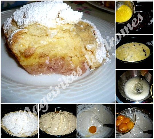 Χτυπάμε τα ασπράδια σε μαρέγκα , ρίχνουμε και τη μισή ζάχαρη και συνεχίζουμε το χτύπημα να σφίξει η μαρέγκα . Προσθέτουμε και την άλλη μισή , ρίχνουμε και τους κρόκους σιγά σιγά ανακατεύοντας ελαφρά .