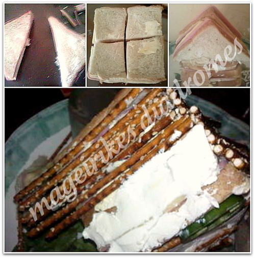 6. Η οροφή τώρα. Το τοστ εδω το κοβω διαγώνια. Εχω αλείψει καλά το τελευταίο τοστ και το βάζω με τη μύτη του τριγώνου προς τα επάνω, συνεχίζω αλείφοντας με τυρί τη πλευρά του, για να κολισει το επόμενο τρίγωνο. Αλείφω ολο το σπιτάκι με κρεμα και κολαω στην οροφή τα κρακερς. Φτιαχτε το οπως στη φωτο.