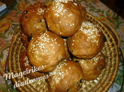 - Βγάζουμε για λίγο τα σταφιδόψωμα τα ραντίζουμε ελαφρά με νερό και πασπαλίζουμε σουσάμι .Τα ξαναβάζουμε στο φούρνο στους 160 βαθμούς και τα ψήνουμε 30 λεπτά!