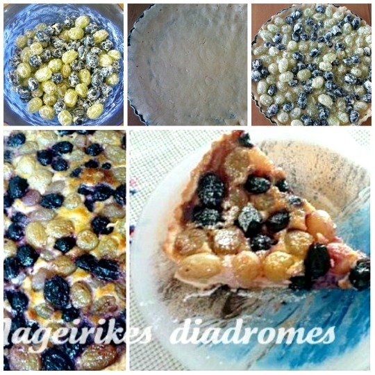 - Αδειάζουμε μέσα το μείγμα αυγού - κρέμας γάλακτος και σκορπίζουμε σε όλη την επιφάνεια τα σταφύλια.