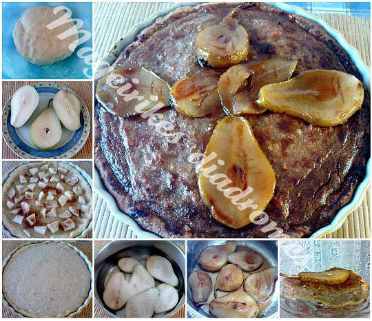 - Μόλις βγάλουμε την τάρτα από το φούρνο την διακοσμούμε με τα καραμελωμένα αχλάδια και αφήνουμε να κρυώσει.