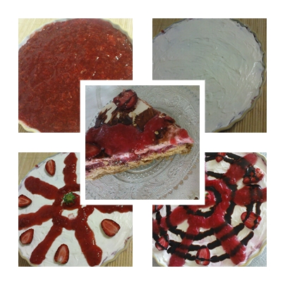 - Στρώνουμε απάνω στην ζύμη ή στη βάση μπισκότου την κρέμα φράουλας, κρατάμε 3-4 κ.σ. για την διακόσμηση. Χτυπάμε το τυρί με την άχνη και το ξύσμα λεμονιού και βάζουμε πάνω στην κρέμα. Ρίχνουμε απάνω από την κρέμα που κρατήσαμε και την διακοσμούμε όπως μας αρέσει, με φράουλες, σοκολάτα κ.αλ.