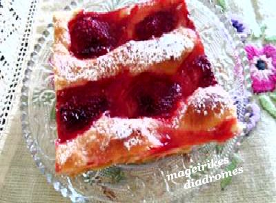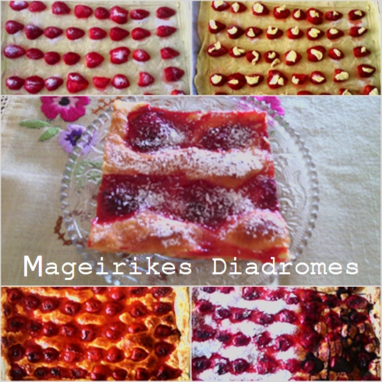 Εγώ απλά την πασπάλισα με άχνη ,οι χυμοί από τις φράουλες ξεχειλίζουν όταν ψηθούν γίνεται πολύ νόστιμη !! Ωραία θα γίνει επίσης αν ζεστάνουμε σε ένα κατσαρολάκι μαρμελάδα φράουλα ,κεράσι ή βερίκοκο , να την ενώσουμε με τα φρούτα και όπως είναι να τα βάλουμε πάνω στην σφολιάτα χωρίς φυσικά να πασπαλίσουμε με ζάχαρη σε αυτή την περίπτωση.