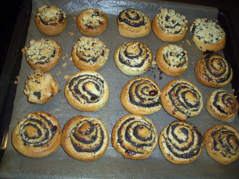 Την άλλη μισή ζύμη την άνοιξα φύλο και εβαλα παπαρουνοσπορο με κρανμπερης και το εκανα ρολο και τα εκοψα σε ενα ποντο και τα εβαλα στο ταψί και στον φουρνο για περίπου 20 λεπτά στο 180ο.