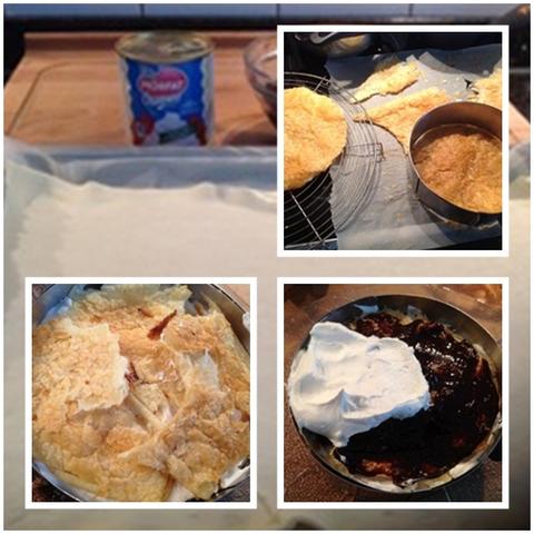 - Βαζουμε σε πιατελα ενα φυλλο σφολιατας, βαζουμε το δαχτυλίδι της φορμας και το κλεινουμε, βαζουμε επανω στην σφολιατα την μιση μαρμελαδα και την μιση σαντιγί, βαζουμε τα τριματα που εχουμε απο την σφολιατα, παλι την υποληπη μαρμελαδα και την σαντιγί, σκεπαζουμε με το ολοκληρο φυλλο σφολιατας και βγάζουμε το δαχτυλίδι .