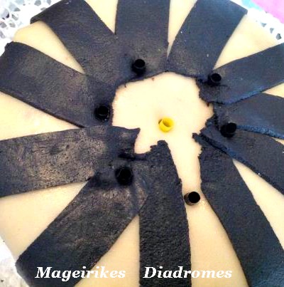 - Κοβουμε και εναν κυκλο απο αμυγδαλοπαστα που ειναι στο χρωμα απο τις λωριδες μας και την τοποθετουμε και αυτη γυρω -γυρω στην τουρτα,( κοιταξτε τις φωτο), την βαζουμε στο ψυγειο μέχρι να την σερβιρουμε