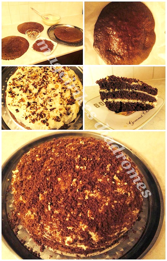 - Βάζουμε ανάμεσα σε καθε παντεσπάνι κρέμα και καρύδια.