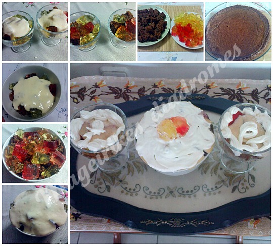 - Ξεκινάμε να στήσουμε το γλυκό μας. Σε ένα μπολ βάζουμε πρώτα λίγα κυβάκια κέικ,τα ραντίζουμε με κονιάκ,απάνω βάζουμε τα κυβάκια ζελέ και τα καλύπτουμε με την κρέμα.