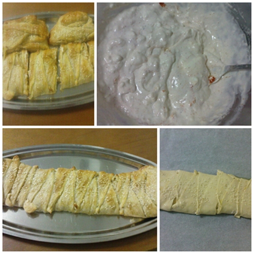 - Διπλώνουμε τις λωρίδες σταυρωτά-διαγωνίως, αλείφουμε με λάδι ή αυγό χτυπημένο, πασπαλίζουμε με σουσάμι και ψήνουμε στους 180ο για 30-35 λεπτά να ροδίσει.