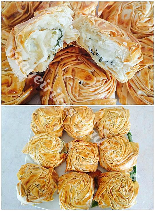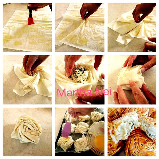 - Ειναι ενα πακέτο φύλλο κρούστας το οποίο ανοίγουμε, βάζουμε στο κάθε ένα φύλλο βουτυρο με πινέλο κι σε μερικά σημεία πετακτά και ξεκινάμε απο τη μεση και στρίβουμε με τα δάκτυλά μεχρι να μας γίνει σαν λακουβα .