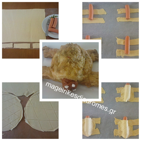 - Με μαχαιράκι χαράζουμε σταυρωτά το κέλυφος της χελώνας. Το ίδιο θα κάνουμε αν χρησιμοποιήσουμε σφολιάτα. Κόβουμε κάθε λουκάνικο στη μέση.