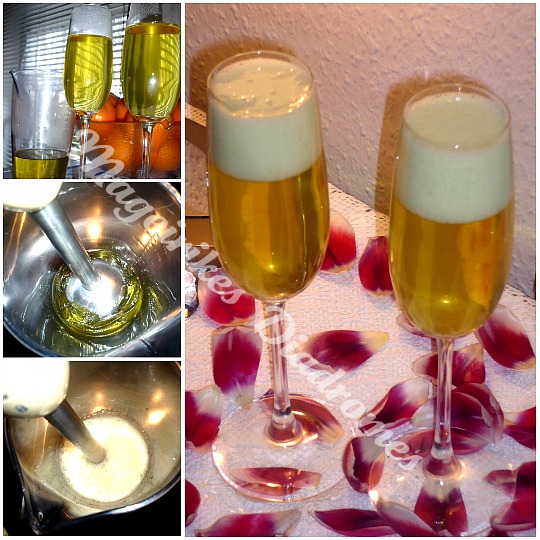 - Με το μινι πιμερ στην υψηλότερη ταχύτητα χτυπάμε μέχρι να αφρίσει το 1/4 του υγρού ζελέ που εχουμε στο μπολακι, ετσι που να γινει ενας αφρος. Με ενα Κουταλάκι του γλυκού βαζουμε επανω στο ζελε που εχουμε στα ποτήρια. Τωρα Θα μοιάζει σαν μπύρα.