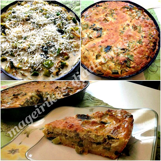 - Τωρα φτιάχνουμε την κρέμα: Χτυπάμε στο μίξερ όλα τα υλικά μαζί. Τα ανακατεύουμε με το πράσσο και ρίχνουμε το μίγμα μεσα στη φόρμα. Πασπαλίζουμε με το τυρι και ψήνουμε για 35 λεπτα. Τρώγεται ζεστο και κρύο