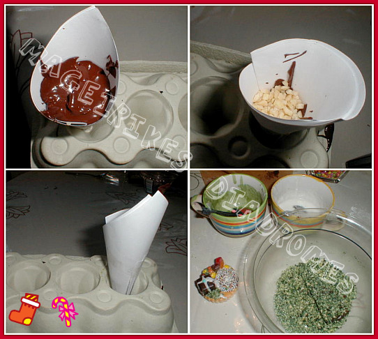 Γεμίζουμε τα χωνάκια μέχρι την μέση με την σοκολάτα, ρίχνουμε μέσα μερικά αμύγδαλα ή m&m, τα ανακατεύουμε, ρίχνουμε πάλι σοκολάτα, πάλι λίγο ανακάτεμα και τα αφήνουμε να κρυώσουν, δηλαδή να παγώσουν