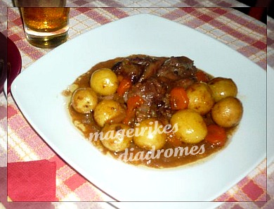 - Μεταφέρουμε το περιεχόμενο της κατσαρόλας σε γάστρα και την βάζουμε στο φούρνο. Ψήνουμε για τρείς ώρες και στη διάρκεια αυτή ανακατεύουμε το κρέας κάθε μια ώρα απαλά. Αν σωθούν τα υγρά συμπληρώνουμε με ζεστό νερό.