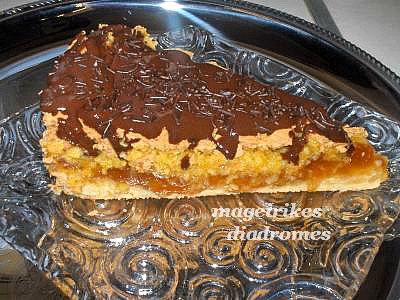 - Χτυπάμε το βούτυρο με τη ζάχαρη, και προσθέτουμε τον κρόκο ,το κονιάκ και το αλεύρι λίγο-λίγο. Κάνουμε μια ζύμη απαλή και βουτυράτη σαν του κουραμπιέ. Την στρώνουμε με την παλάμη μας σένα ταψάκι 26 Νο και απλώνουμε επάνω την μαρμελάδα αραιωμένη με λίγο κονιάκ.
